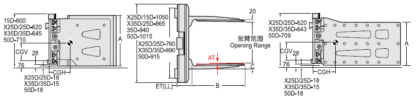 Capacity 承載能力(kg)Catalog Order NO 型號Mounting Class 安裝等級 Opening Range張臂范圍(mm)Rad Height夾板高度A(mm)Arm Length臂長B(mm)Arm Thickness臂厚C(見注5)(mm)Arm Toe in內扣量AT(見注6)(mm)Vertcial Center Of Gravity垂直重心CGV(mm) Weight 自重(kg)Effective 失載距ET(mm)Horizontal Center of Gravity 水平重心CGH(mm)